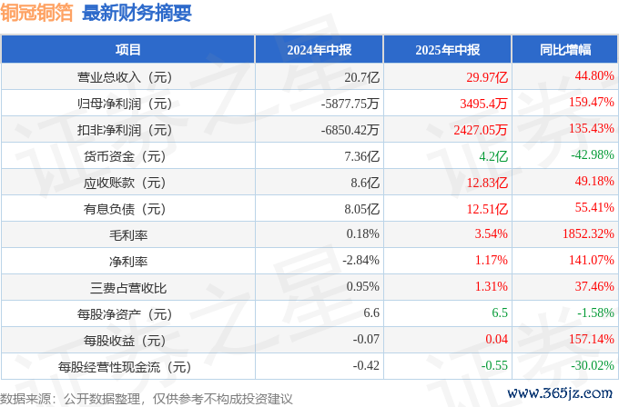 据证券之星公开数据整理,近期铜冠铜箔(301217)发布2025年中报。截至本报告期末,公司营业总收入29.97亿元,同比上升44.8%,归母净利润3495.4万元,同比上升159.47%。按单季度数据看,第二季度营业总收入16.02亿元,同比上升36.08%,第二季度归母净利润3020.25万元,同比上升197.18%。本报告期铜冠铜箔盈利能力上升,毛利率同比增幅1852.32%,净利率同比增幅141.07%。
